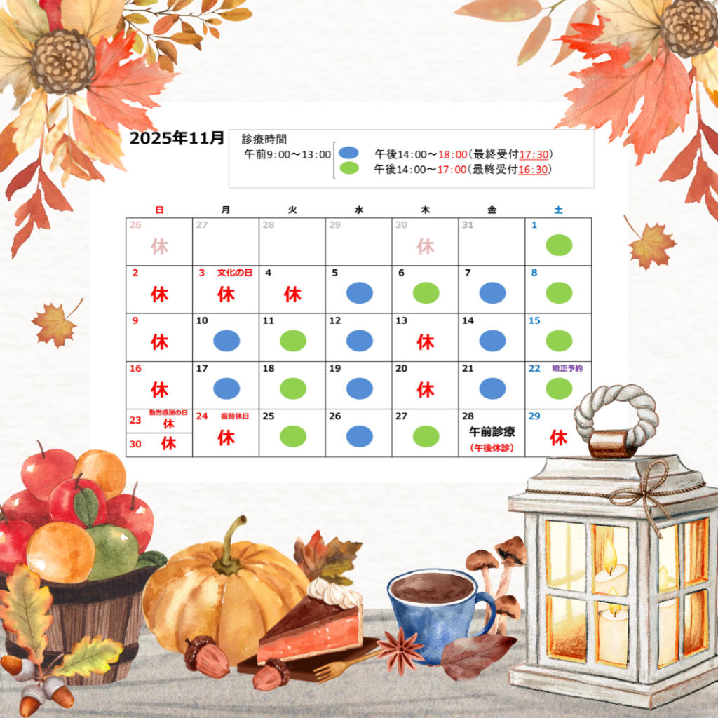 11月3日は文化の日のため休診日となります。また、6日木曜日の休診日を4日火曜日と入れ替えて2日日曜日から4日火曜日までの3連休となります。なお、6日の木曜日は診療日となります。