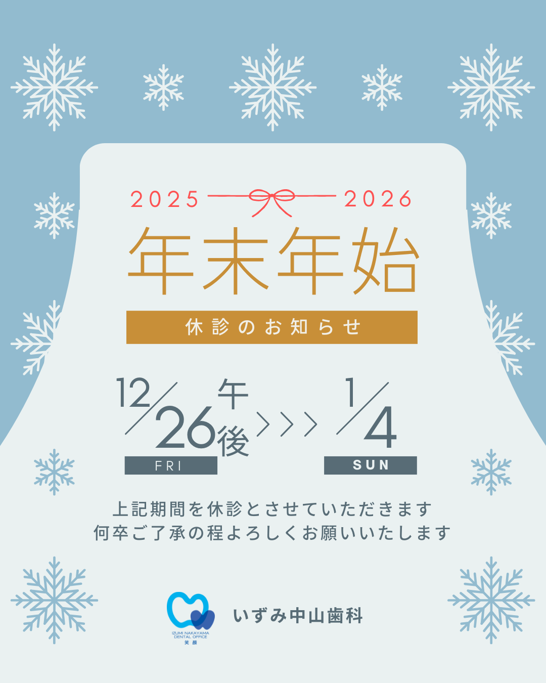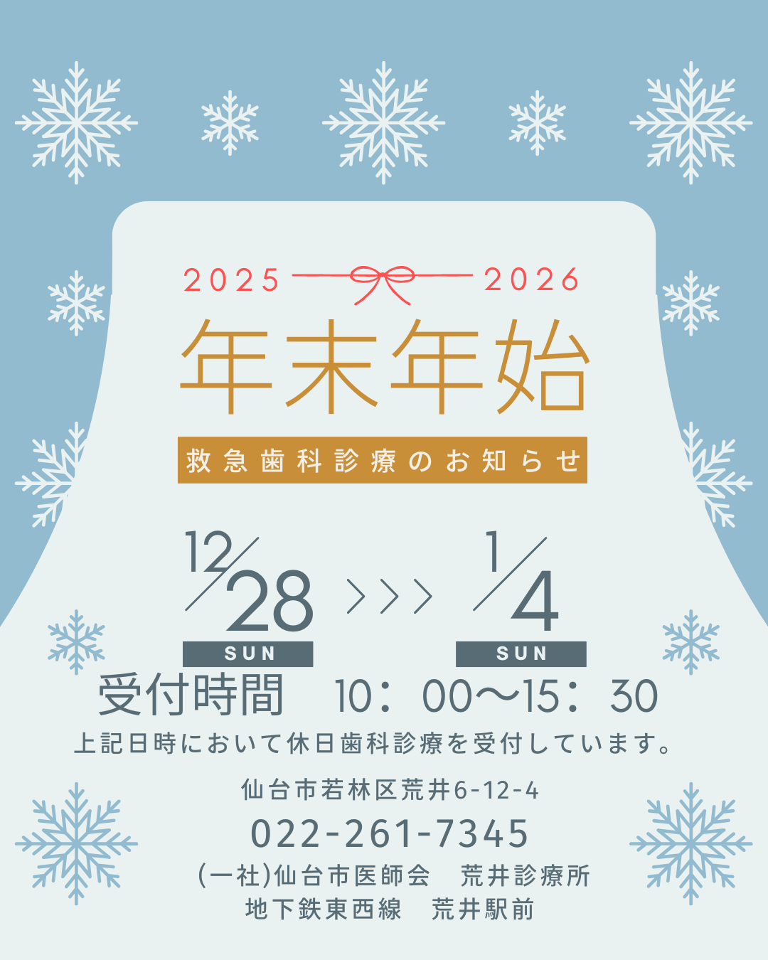 こんにちは! 12月も入り、天気予報を見ると仙台でも雪予報が出るようになってきました。外を走る車もいつにもまして目まぐるしく見えます。そして医院の状況としては、年内に口腔内の清掃をして新年を迎えたいという思いからか患者さんの数もいつもより多くなっていて、予約が取りづらい状況になってきました。 それでも、12月は月末に年末の休診が入り、後半になるとさらに時間が経つのが早く感じるようになって早めに年末年始の休診日のお知らせをさせていただきます。 令和7年の診療は12月26日午前中までとさせていただき、26日午後から休診とさせていただきます。 また、明けて令和8年は1月4日まで休診とさせていただき、1月5日より診療を再開させていただきます。 ご迷惑おかけいたしますが、よろしくお願いいたしますm(__)m なお、休診期間中の12月28日(日)から新年1月4日(日)までは地下鉄東西線荒井駅すぐの「荒井診療所(022-261-7345)」にて救急歯科診療が実施されます。休診期間中に万が一口腔内に変調をきたした場合は、そちらをご利用ください。![]()