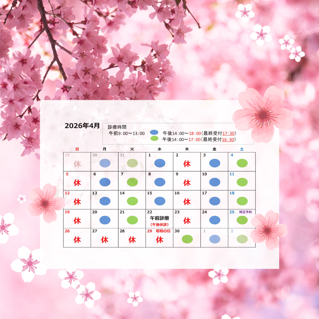 こんにちは! 3月も後半に入り、桜の便りも徐々に聞かれるようになってきました。ただ、仙台は春のお彼岸を過ぎても雪が舞ったように、桜を見られるのはもう少し先になりそうです。 この時季は晴れた日の日中は陽射しが心地好く、窓辺などは気持ちよく過ごせることもありますが、朝晩はまだまだ気温が低く、1日の中でも気温差が大きくなりますので、体調には十分に気を付けてお過ごしください。 さて、4月は1週目から4週目までは通常通り木曜日と日曜日が休診日となります。 最終週は27日、28日を休診日とさせていただき、26日から29日まで4連休とさせていただきます。 なお、30日木曜日は診療日とさせていただき、5月1日、2日と合わせ、ゴールデンウィーク中の診療日は4月30日、5月1日、2日の3日間となりますのでご注意ください。 また、毎月のスタッフミーティングを行うため、今月は22日水曜日を午前診療、午後休診とさせていただきます。